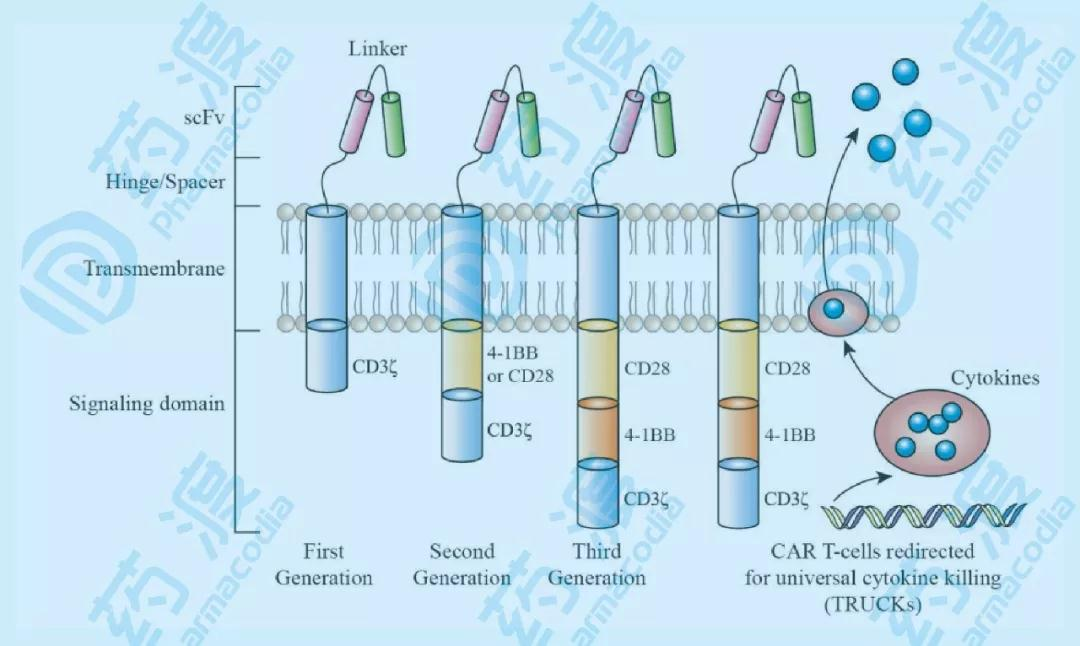 Car-T細(xì)胞發(fā)展至今也并非一帆風(fēng)順,1987年,以色列科學(xué)家Zelig Eshhar首次提出嵌合抗原受體概念(chimeric antigen receptor,CAR);在1980年代,有科學(xué)家開(kāi)始專注工程T細(xì)胞的研究;在1993年,第一代基于CD3-ζ鏈的Car-T細(xì)胞被發(fā)展出來(lái)。該Car-T細(xì)胞雖然具有激活T細(xì)胞的能力,但是只含有激活受體CD3-ζ,其抗腫瘤效果比較弱,不具備大規(guī)模殺滅腫瘤細(xì)胞的能力。