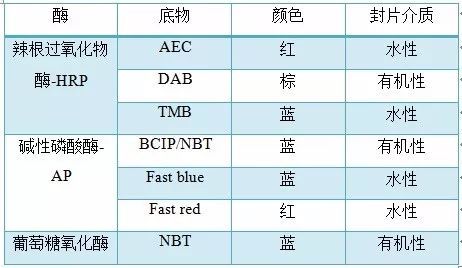 該表格列舉了常用的酶和搭配的底物及封片介質(zhì),根據(jù)實(shí)驗(yàn)需要進(jìn)行選擇。